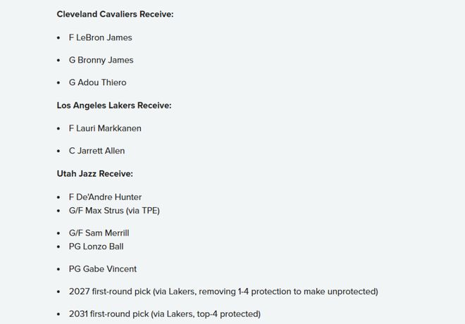 爵士得到:亨特+斯特魯斯+梅里爾+鮑爾+文森特+2027年湖人首輪(取消前四保護,成為無保護首輪)+2031年湖人前四保護首輪。