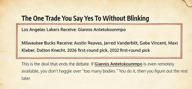 美媒《Fadeaway World》撰文建議,湖人應該將里夫斯、克萊伯、文森特、范德比爾特、克內克特以及2026年、2032年的首輪簽送到密爾沃基,換回字母哥。