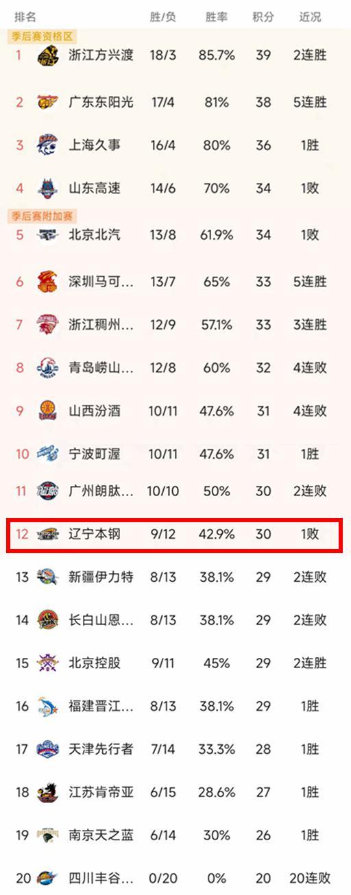 遼寧功勛拼圖瓦解,重建進(jìn)入陣痛期,近6戰(zhàn)5負(fù)下滑第12名