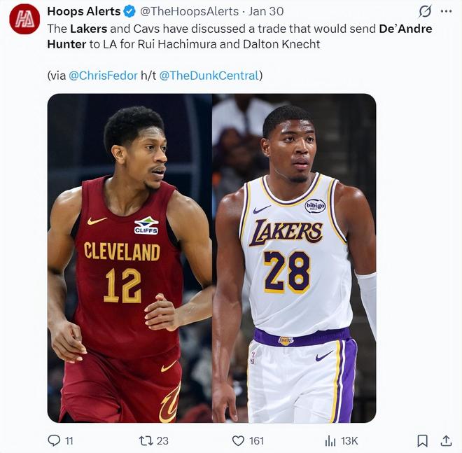 1月30日時,騎士隊記者克里斯-菲德爾就透露,騎士與湖人探索過關于亨特的交易,湖人希望用克內克特、八村壘去換亨特。