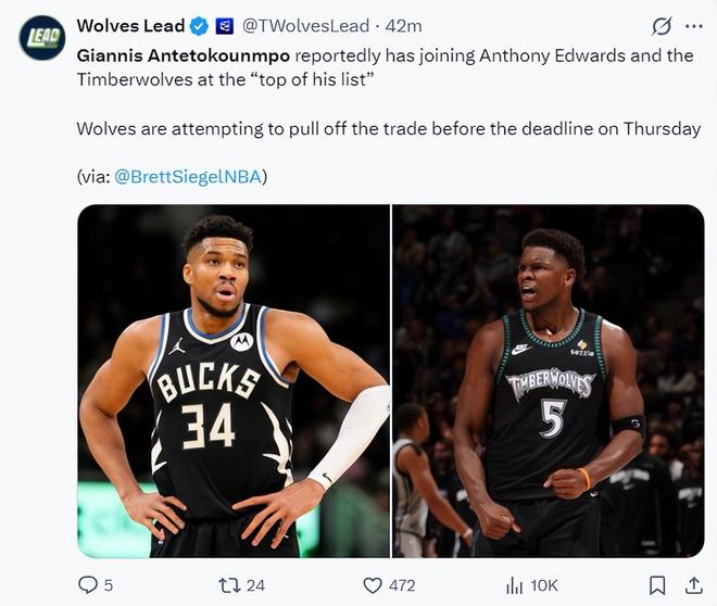 隨后NBA記者Brett Siegel報(bào)道,揚(yáng)尼斯把加盟森林狼搭檔愛(ài)德華茲視為自己的首選,森林狼也正在努力推動(dòng)揚(yáng)尼斯的交易。