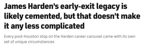 這一次的目的地是克利夫蘭——在快船的征程未能如愿后,在與費城不歡而散后,在布魯克林短暫停留后。頻繁改換門庭、季后賽早早出局,這些都將成為哈登職業生涯履歷中無法抹去的印記。單從紙面來看,他離開火箭后的這段生涯軌跡,確實難逃外界的詬病。