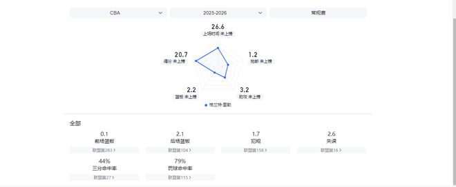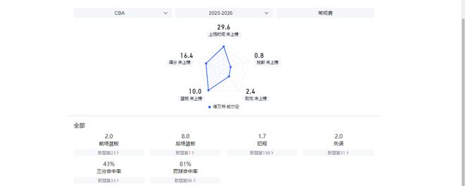 另外,他也是一名出色的全能空間型四號位,第一階段場均可得到16.4分10籃板2.4助攻1.4蓋帽,三分命中率高達43%。