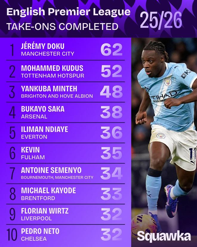 英超第23輪戰罷,數據機構Squawka統計了本賽季英超成功過人數據,曼城邊鋒多庫高居榜首。