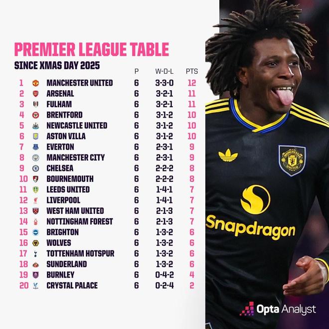 據足球數據網站Opta統計,自圣誕節以來沒有任何英超球隊的勝率超過50%,曼聯拿到12分,是同期拿分最多的球隊。
