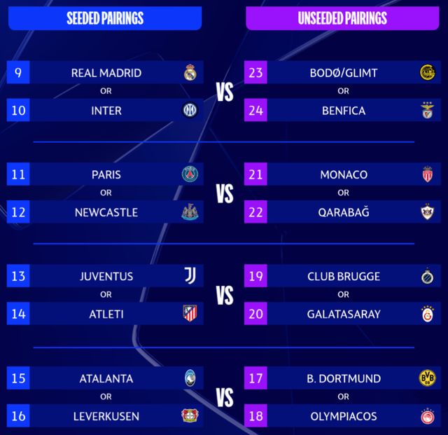 排名9-16的球隊,將作為種子隊:皇馬、國米、巴黎圣日耳曼、紐卡、尤文、馬競、亞特蘭大、勒沃庫森。