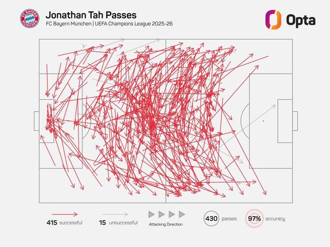 據Opta統計,約納坦-塔本賽季歐冠至今嘗試了430次傳球,415次成功,15次失敗,傳球成功率高達97%,這位拜仁后衛是本賽季歐冠至今傳球成功率最高的球員。